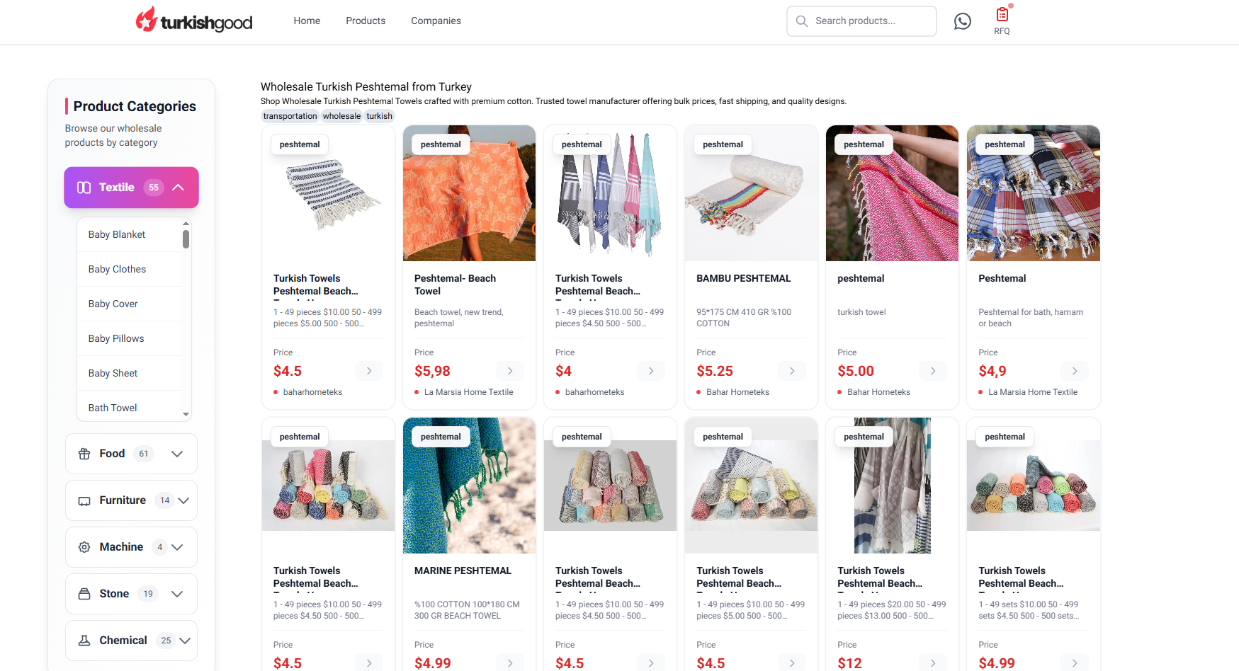 The site has an enormous and incredibly structured Textile section that has more than 75 niche subcategories. Wholesale Turkish Peshtemal Towel and other home textile product producers are readily found here. The huge list will allow finding the manufacturers possessing the best weaving traditions and modern production opportunities in the shortest time possible. This narrowed-down search saves you a lot of time and effort in finding the right wholesale partners.